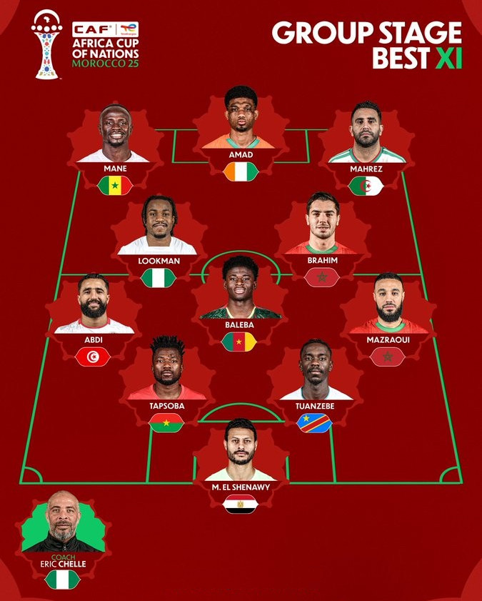 非洲杯官方公布,小组赛最好11东说念主出炉,门将是埃及的希纳维,后卫包括马兹拉维、图安泽贝、塔普索巴和阿卜迪,中场包括巴莱巴、卢克曼和迪亚斯,先锋包括马内、迪亚洛和马赫雷斯,主领略则是来自尼日利亚的谢勒。