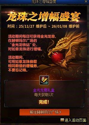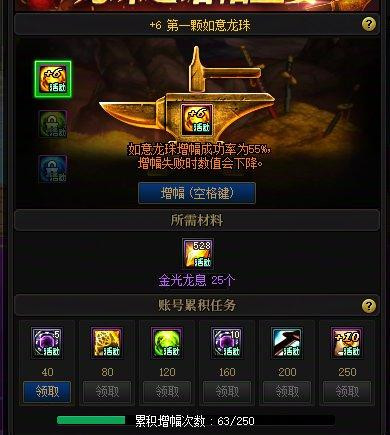 通过逐日签到和通关地下城中获取到的材料来增幅,刷完深谷以后顺道去赫顿马尔广场点几下增幅龙珠,如果点到增幅10即可收手,最多不错索要3次增幅10券,气运稍差时可在累计任务中获取一张增幅10券。